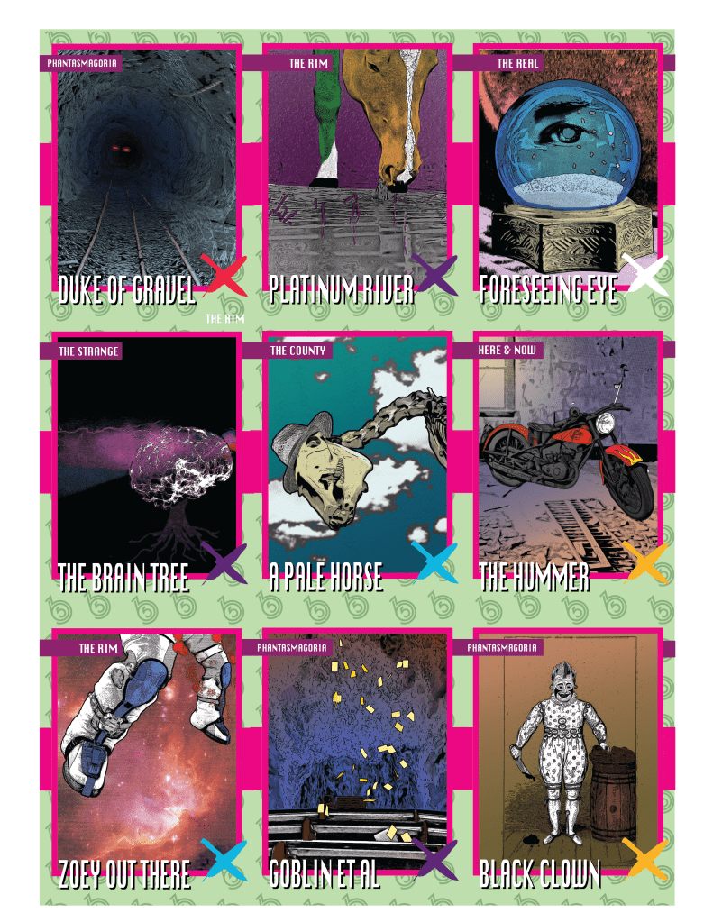 The illustrations were stock photos that I composited, stylized, and recolored. The layouts were modeled after the 90s X-Men trading cards. (If you can think of a more iconic look, save it for your custom trading card project.)